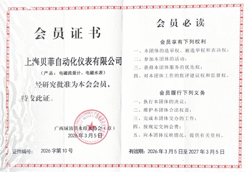近日,上海贝菲(全称:上海贝菲自动化仪表有限公司)正式成为广西城镇供水排水协会会员单位!这标志着公司在供水排水领域的专业实力与服务品质获得了行业协会的高度认可。